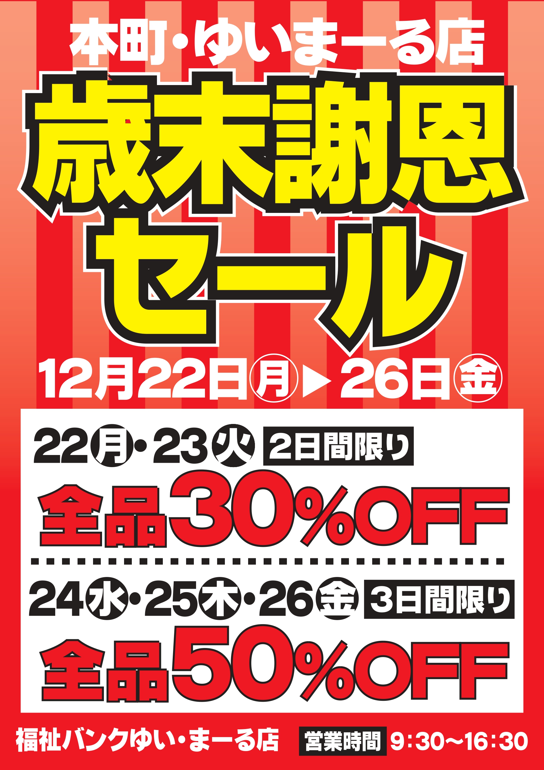 ゆいまーる店からのお知らせ 2025.12.20 Tweet Share Hatena Pocket RSS feedly Pin it 本町・ゆいまーる店からのお知らせです。 ゆいまーる店の歳末謝恩セールは 22日(月)・23日(火)の2日間が、全品30%OFF! 24日(水)・25日(木)・26日(金)の3日間が、全品半額! ゆいまーる店の営業時間は、朝9時30分~夕方4時30分です。 皆様のお越しをお待ちしております。 Tweet Share Hatena Pocket RSS feedly Pin it 福祉バンクみたけ店 歳末謝恩セール前の記事 年末年始休業のお知らせ次の記事