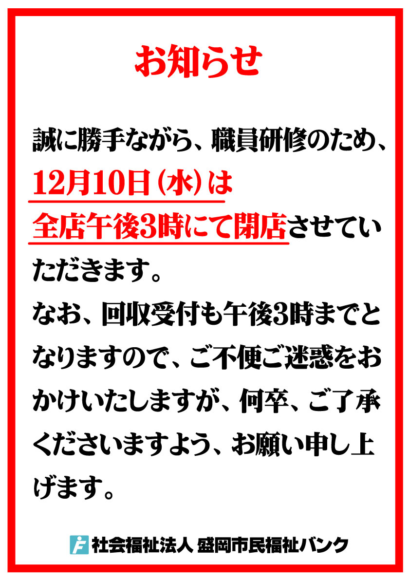 福祉バンクからお知らせ 2025.12.8 Tweet Share Hatena Pocket RSS feedly Pin it Tweet Share Hatena Pocket RSS feedly Pin it 12月各店休業日について前の記事 渋民店と西根店からのお知らせ次の記事